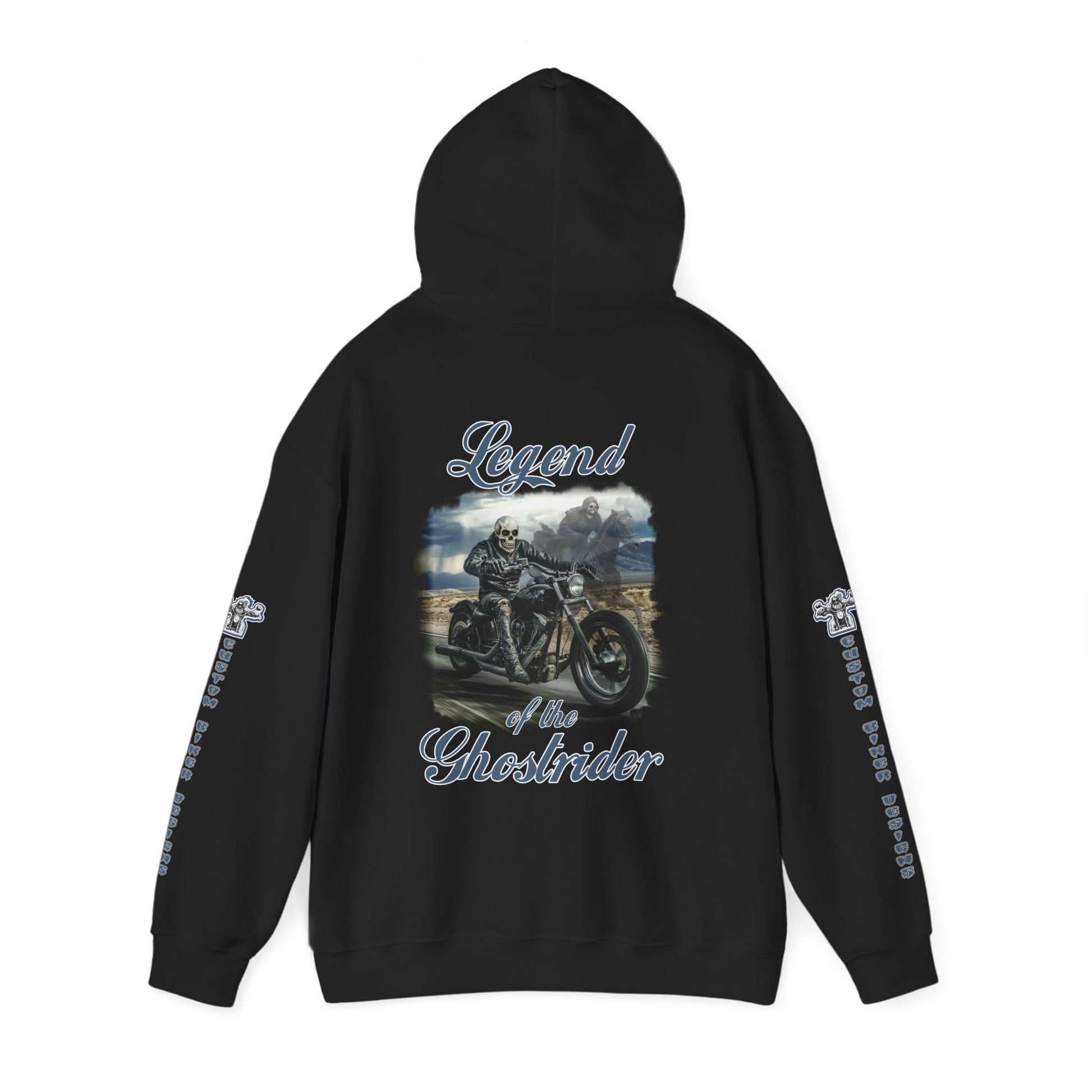 Legends of the Ghostrider black hoodie features a faded cinematic back graphic of a lone rider on a vintage chopper beneath a storm-split sky, with "Legend" and "Ghostrider" script framing the design. Matching script runs down the sleeves with a small chest emblem for balance. The 50/50 cotton-poly blend (8.0 oz/yd²) delivers warmth and softness that improves with every wash. No side seams, double-lined hood, and a roomy kangaroo pocket complete the look. Perfect for layering on rides or wearing in the garage—this hoodie reads like an old road tale.