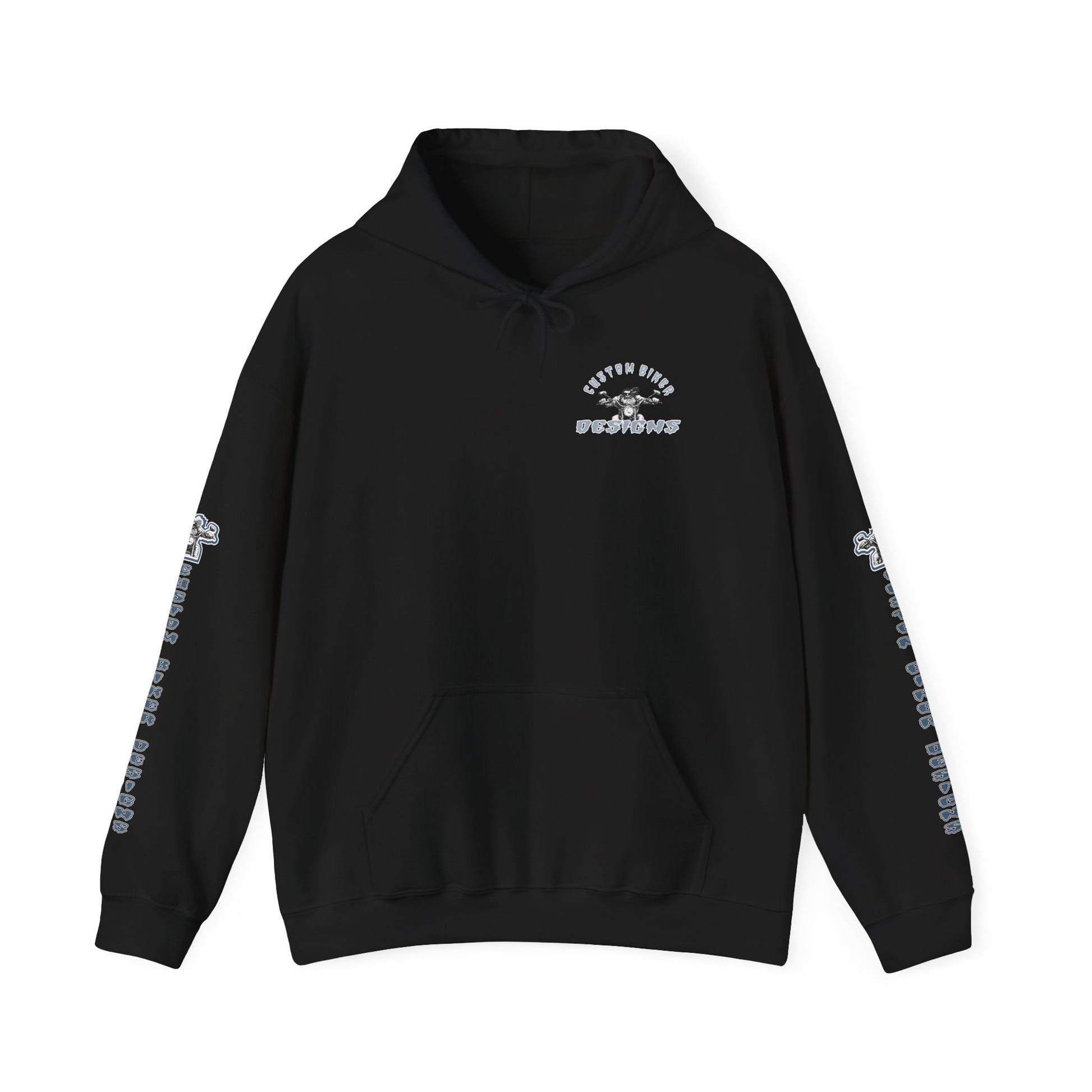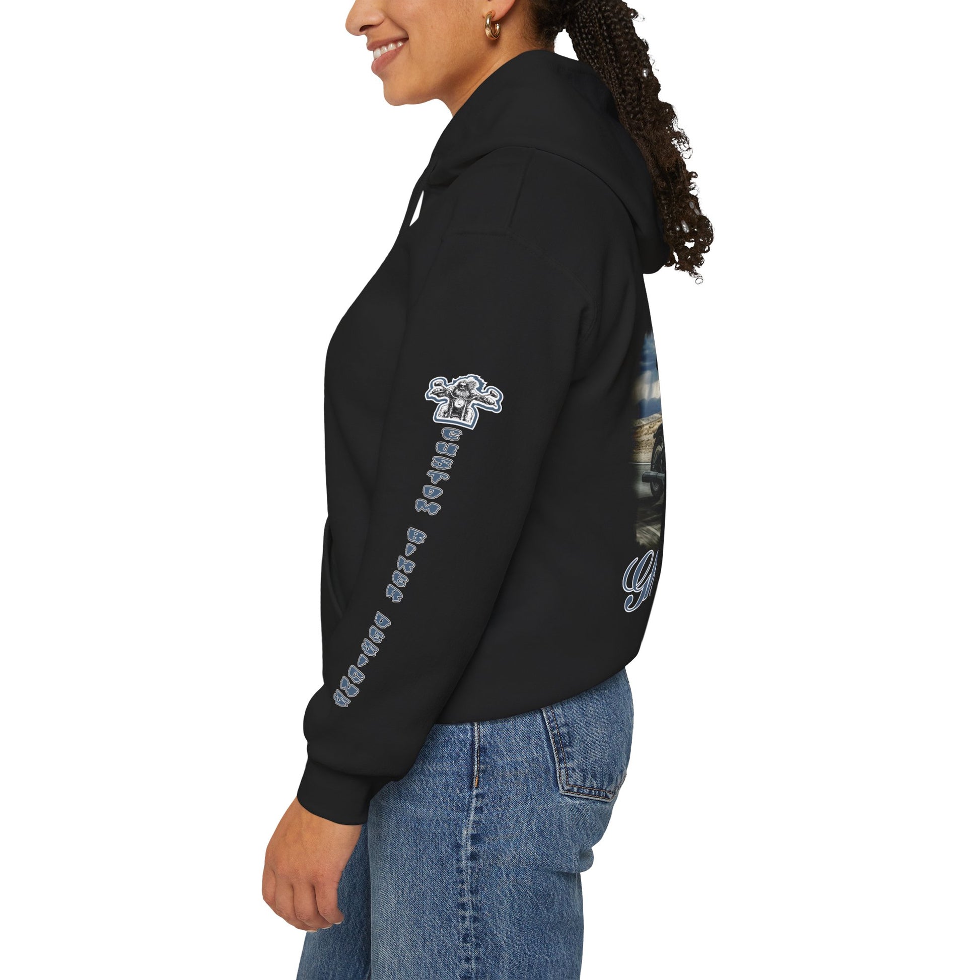 This black hoodie carries a reclaimed-road vibe—soft, weighty, and built to layer over long rides or late-night bonfires. A faded, cinematic back graphic shows a lone rider on a vintage chopper rolling through a storm-split sky, framed by retro script reading “Legend” and “Ghostrider.” Matching script runs down both sleeves and a small chest emblem anchors the front for a balanced look. The fabric’s cotton–poly blend feels warm and substantial without feeling stiff; the double-lined hood and color-matched drawcord add subtle, durable details. Wear it thrown over a tee after a sunset cruise or keep it on while swapping stories in the garage—the design reads like an old road tale and gets softer with every wash.
