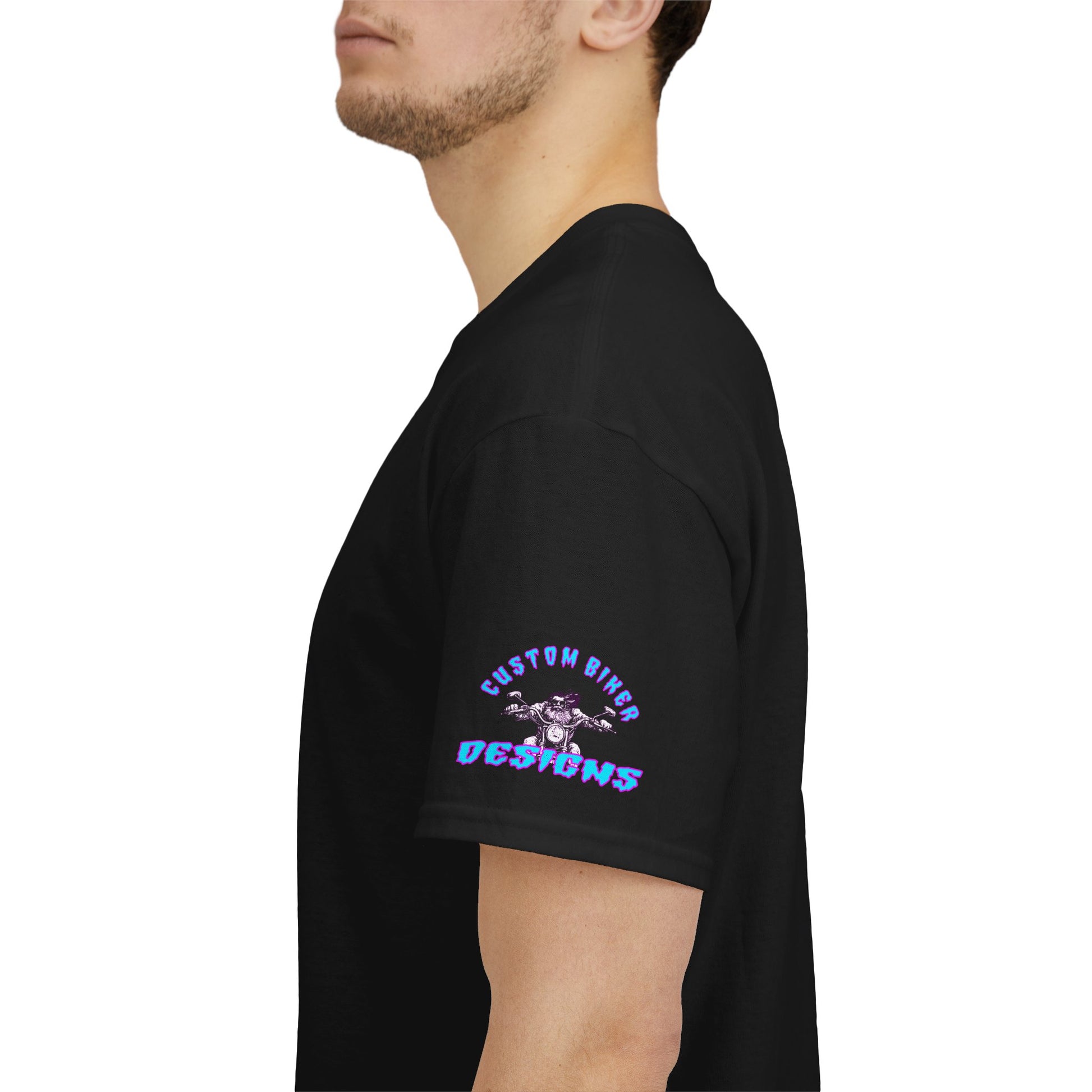 Black cotton tee with a striking vintage motorcycle graphic accented in neon turquoise and magenta. The bold "CAUTION" lettering captures that rebellious retro-electro attitude. Built from premium 180 g/m² fabric with tubular knit construction and reinforced collar and shoulders for durability. Oeko-Tex certified, ethically sourced US cotton backed by a 2-year EU warranty. Wear it for late-night rides, casual hangs, or whenever you want instant edge. Machine wash cold, tumble dry low.